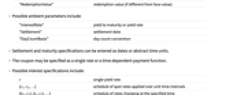 "FaceValue" face value or par value "Coupon" coupon rate or payment function "Maturity" maturity or call/put date "CouponInterval" coupon payment interval "RedemptionValue" redemption value (if different from face value) - Possible ambient parameters include: