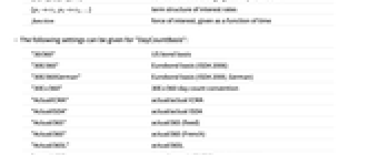 r single yield rate {r1,r2,…} schedule of spot rates applied over unit time intervals {{t1,r1},{t2,r2},…} schedule of rates changing at the specified time {p1->r1,p2->r2,…} term structure of interest rates function force of interest, given as a function of time - The following settings can be given for "DayCountBasis":
