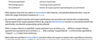 "Value" price adjusted for accrued interest "FullValue" unadjusted price "AccruedInterest" accrued interest at settlement "Duration" Macaulay duration "ModifiedDuration" modified duration "Convexity" convexity "CouponPeriodDays" days in coupon period containing the settlement "CouponToSettlementDays" days from previous coupon to settlement "SettlementToCouponDays" days from settlement to next coupon "NextCouponDate" next coupon date "PreviousCouponDate" previous coupon date "RemainingCoupons" remaining coupon payments "AccruedFactor" fraction of coupon payment representing the accrued interest - When abstract time units are used in a FinancialBond with maturity