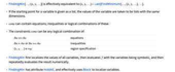 lhs==rhs equations lhs>rhs or lhs>=rhs inequalities {x,y,…}∈reg region specification - FindArgMin first localizes the values of all variables, then evaluates f with the variables being symbolic, and then repeatedly evaluates the result numerically.