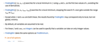 - FindArgMin[f,{x,x0,xmin,xmax}] searches for a local minimum, stopping the search if x ever gets outside the range xmin to xmax.