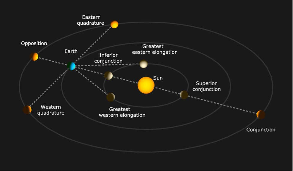 {"Conjunction",body1,body2} conjunction of two bodies in a longitude coordinate {"InferiorConjunction",body} the body passes between the Sun and the observer {"SuperiorConjunction",body} the body passes behind the Sun {"Conjunction",body} inferior or superior conjunction of a body with the Sun {"Opposition",body} opposition of a body and the Sun - Event types related to quadratures and greatest elongations include: