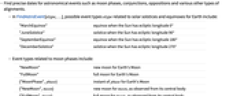 - Find precise dates for astronomical events such as moon phases, conjunctions, oppositions and various other types of alignments.