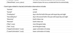 "NewMoon" new moon for Earth's Moon "FullMoon" full moon for Earth's Moon {"MoonPhase",phase} instant of phase for Earth's Moon {"NewMoon",moon} new moon for moon, as observed from its central body {"FullMoon",moon} full moon for moon, as observed from its central body {"MoonPhase",moon,phase} instant of phase for moon, as observed from its central body - Event types related to rise/set/culmination observations include: