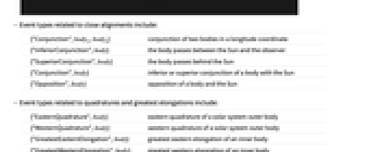 {"EasternQuadrature",body} eastern quadrature of a solar system outer body {"WesternQuadrature",body} western quadrature of a solar system outer body {"GreatestEasternElongation",body} greatest eastern elongation of an inner body {"GreatestWesternElongation",body} greatest western elongation of an inner body - Event types related to physical distance include: