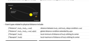 {"Distance",body1,body2,cond} distance between body1 and body2 obeys condition cond {"Distance",body1,body2,cond,adjst} global distance condition extended by adjst {"Periapsis",body} local minimum of distance of body orbiting its center {"Apoapsis",body} local maximum of distance of body orbiting its center - Event types related to angular separation include: