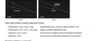 {"Separation",body1,body2,cond} angle between body1 and body2 obeys condition cond {"Separation",body1,body2,cond,adjst} angular condition extended by adjst {"Appulse",body1,body2} local minimum of angular separation between two bodies {"Appulse",body} local minimum of separation between body and the Sun - Possible conditions cond include: