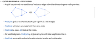 - FindCycle works with undirected graphs, directed graphs, and multigraphs.
