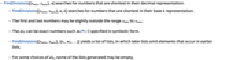 - FindDivisions[{xmin,xmax},n,k] searches for numbers that are shortest in their base k representation.