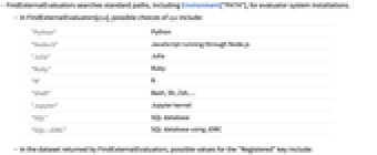 "Python" Python "NodeJS" JavaScript running through Node.js "Julia" Julia "Ruby" Ruby "R" R "Shell" Bash, Sh, Zsh, ... "Jupyter" Jupyter kernel "SQL" SQL database "SQL-JDBC" SQL database using JDBC - In the dataset returned by FindExternalEvaluators, possible values for the "Registered" key include: