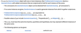 - If scene is a GeometricScene object with one or more instances, then FindGeometricConjectures returns a GeometricScene with added conclusions that are conjectured to hold for each instance of the scene.