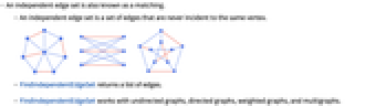 - FindIndependentEdgeSet works with undirected graphs, directed graphs, weighted graphs, and multigraphs.