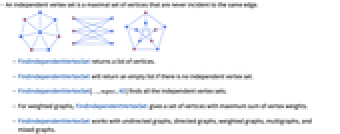 - FindIndependentVertexSet works with undirected graphs, directed graphs, weighted graphs, multigraphs, and mixed graphs.