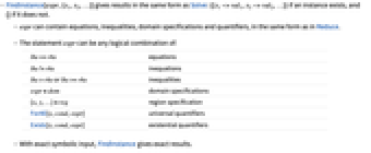 lhs==rhs equations lhs!=rhs inequations lhs>rhs or lhs>=rhs inequalities expr∈dom domain specifications {x,y,…}∈reg region specification ForAll[x,cond,expr] universal quantifiers Exists[x,cond,expr] existential quantifiers - With exact symbolic input, FindInstance gives exact results.