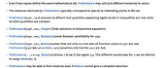 - FindInstance[expr,vars] assumes by default that quantities appearing algebraically in inequalities are real, while all other quantities are complex.