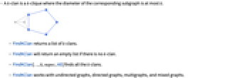 - In contrast, FindKClique can be used to find k-cliques of different subgraph diameter, from 1 to the largest possible size (in general n for a graph on n vertices). FindKClique can be used to find a single k-clique of specified subgraph diameter, a specified number of cliques, or all.