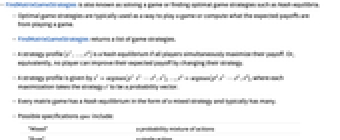 - FindMatrixGameStrategies is also known as solving a game or finding optimal game strategies such as Nash equilibria.