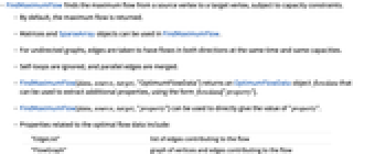 - FindMaximumFlow[data,source,target,"OptimumFlowData"] returns an OptimumFlowData object flowdata that can be used to extract additional properties, using the form flowdata["property"].