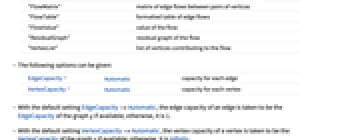 EdgeCapacity Automatic capacity for each edge VertexCapacity Automatic capacity for each vertex - With the default setting EdgeCapacity->Automatic, the edge capacity of an edge is taken to be the EdgeCapacity of the graph g if available; otherwise, it is 1.