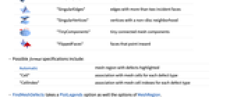 Automatic mesh region with defects highlighted "Cell" association with mesh cells for each defect type "CellIndex" association with mesh cell indexes for each defect type - FindMeshDefects takes a PlotLegends option as well the options of MeshRegion.