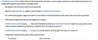 - FindMinimumCostFlow[data,…,"OptimumFlowData"] returns an OptimumFlowData object flowdata that can be used to extract additional properties, using the form flowdata["property"].