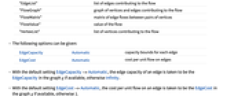 EdgeCapacity Automatic capacity bounds for each edge EdgeCost Automatic cost per unit flow on edges - With the default setting EdgeCapacity->Automatic, the edge capacity of an edge is taken to be the EdgeCapacity in the graph g if available, otherwise Infinity.
