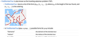 - FindShortestTour returns a list of the form {dmin,{vi1,vi2,…}}, where dmin is the length of the tour found, and {vi1,vi2,…} is the ordering.