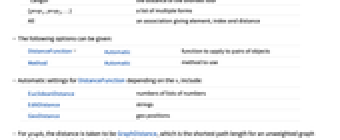 DistanceFunction Automatic function to apply to pairs of objects Method Automatic method to use - Automatic settings for DistanceFunction depending on the vi include: