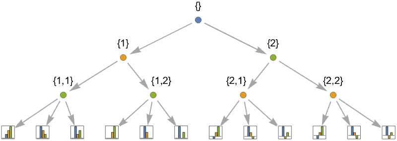 - To specify any action node, use a list of the choices made to reach it, e.g. {1} for taking the first action, {2,1} for taking the second action, then the first action, {} for the initial (root) action node.