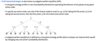 - A subgame perfect equilibrium is defined as a tree game strategy profile where no player can improve their payoff by changing only one action's probability distribution.