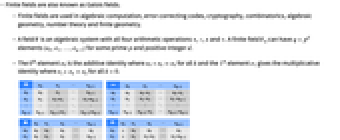 - Finite fields are used in algebraic computation, error-correcting codes, cryptography, combinatorics, algebraic geometry, number theory and finite geometry.