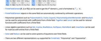 - FiniteFieldElement objects in the same field are automatically combined by arithmetic operations.