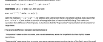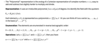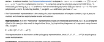 , easy to multiply and divide but slightly harder to add and subtract. - Representation: As in the "Polynomial" representation, it uses an irreducible polynomial
