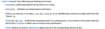 - Flatten "unravels" lists, effectively just deleting inner braces.