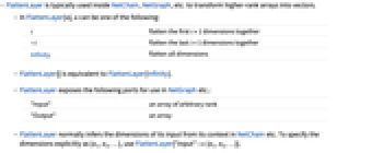 - FlattenLayer is typically used inside NetChain, NetGraph, etc. to transform higher-rank arrays into vectors.