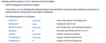 Alignment Automatic how to align objects in the display area Background None background color to use BaselinePosition Automatic how to align with a surrounding text baseline BaseStyle {} base style specifications for the FlipView Enabled Automatic whether controls are enabled FrameMargins Automatic margins inside the overall frame ImageMargins 0 margins around the display area ImageSize Automatic the overall image size for the display area - With the default option setting ImageSize->Automatic, FlipView leaves space only for the expri currently being displayed.