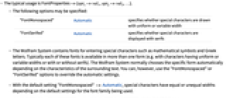 "FontMonospaced" Automatic specifies whether special characters are drawn with uniform or variable width "FontSerifed" Automatic specifies whether special characters are displayed with serifs - The Wolfram System contains fonts for entering special characters such as mathematical symbols and Greek letters. Typically each of these fonts is available in more than one form (e.g. with characters having uniform or variable widths or with or without serifs). The Wolfram System normally chooses the specific form automatically depending on the characteristics of the surrounding text. You can, however, use the "FontMonospaced" or "FontSerifed" options to override the automatic settings.