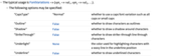 "CapsType" "Normal" whether to use a caps font variation such as all caps or small caps "Outline" False whether to draw characters as outlines "Shadow" False whether to draw a shadow around characters "StrikeThrough" False whether to draw strike-through line through characters "Underlight" None the color used for highlighting characters with a wavy line in the underline position "Underline" False whether to draw underlined characters