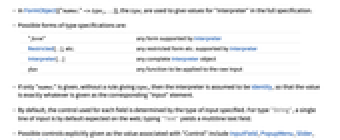 "form" any form supported by Interpreter Restricted[…],etc. any restricted form etc. supported by Interpreter Interpreter[…] any complete Interpreter object tfun any function to be applied to the raw input - If only "namei" is given, without a rule giving typei, then the interpreter is assumed to be Identity, so that the value is exactly whatever is given as the corresponding "Input" element.