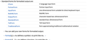 CForm C language input form FortranForm Fortran input form InputForm one‐dimensional form suitable for direct keyboard input MathMLForm MathML form OutputForm character‐based two-dimensional form StandardForm standard two-dimensional form TeXForm TeX input form TraditionalForm form approximating traditional mathematical notation - You can add your own forms for formatted output.