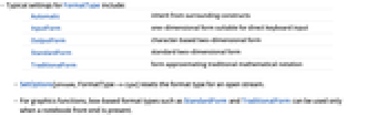 Automatic inherit from surrounding constructs InputForm one-dimensional form suitable for direct keyboard input OutputForm character‐based two-dimensional form StandardForm standard two-dimensional form TraditionalForm form approximating traditional mathematical notation - SetOptions[stream,FormatType->type] resets the format type for an open stream.