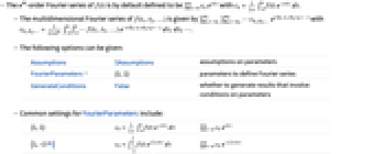 Assumptions $Assumptions assumptions on parameters FourierParameters {1,1} parameters to define Fourier series GenerateConditions False whether to generate results that involve conditions on parameters - Common settings for FourierParameters include: