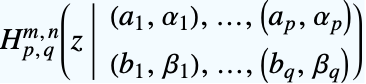 FoxH[{{{a1,α1},…,{an,αn}},{{an+1,αn+1},…,{ap,αp}}},{{{b1,β1},…,{bm,βm}},{{bm+1,βm+1},…,{bq,βq}}},z]