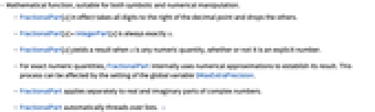 - FractionalPart applies separately to real and imaginary parts of complex numbers.