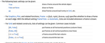 True draw a frame around the whole object False or None draw no frame All draw frames around each entry in Grid, etc. - For Graphics, Plot, and related functions, Frame->{{left,right},{bottom,top}} specifies whether to draw a frame on each edge. With the default setting FrameTicks->Automatic, ticks are included whenever a frame is drawn.