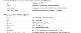spec apply spec to all items {specx} apply specx at successive horizontal positions {specx,specy} apply speck at successive horizontal and vertical positions {specx,specy,rules} also allow explicit rules for individual i,j elements - The speck can have the following forms: