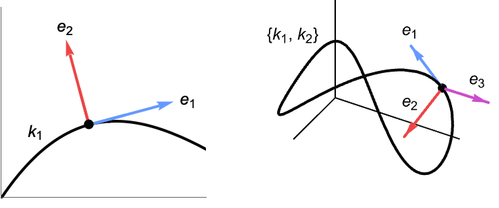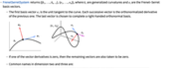 - FrenetSerretSystem returns {{k1,…,kn-1},{e1,…,en}}, where ki are generalized curvatures and ei are the Frenet–Serret basis vectors.