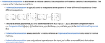 - FrobeniusDecomposition uses only rational operations on the input, so is often a more efficient choice than JordanDecomposition.