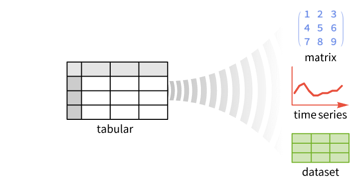 "Columns" collection of TabularColumn objects "Rows" list of rows "Matrix" matrix of values "Dataset" multilevel data "TimeSeries" TimeSeries object "TemporalData" TemporalData object - The association assoc can contain specific information on how to convert tabular to the different forms.