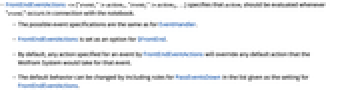 - FrontEndEventActions->{"event1":>action1,"event2":>action2,…} specifies that actioni should be evaluated whenever "eventi" occurs in connection with the notebook.
